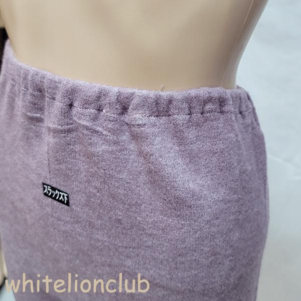 ふわもち両起毛、スラックス下。発熱保温機能素材で抜群の暖かさ。ふわふわの毛布のようなもちもち生地に包まれて、着た瞬間からすぐ暖かい。体温の低い方や寒がりさんにおススメです。お腹周り・腰から太腿・足首にかけて下半身を暖めます。寒い季節にピッタリのあったかインナーです!!
