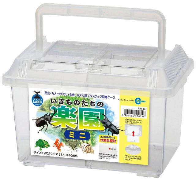 本体サイズ (幅X奥行X高さ) :21×13.5×14cm<br>本体重量:230g<br>原産国:日本<br>◆商品名:インセクトランド プラケース いきものたちの楽園 ミニ<br>商品紹介<br>いきものを出し入れしやすい、大きなスライド式トビラがついた飼育ケース。
