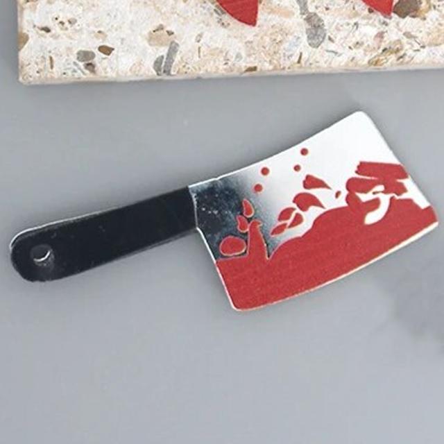 チャームやストラップ、ペンダントやキーホルダーにできるように丸い穴の開いたプラスチック製の血液が付いた中華包丁や鉈をモチーフにした不気味なDIY用クラフトパーツ。