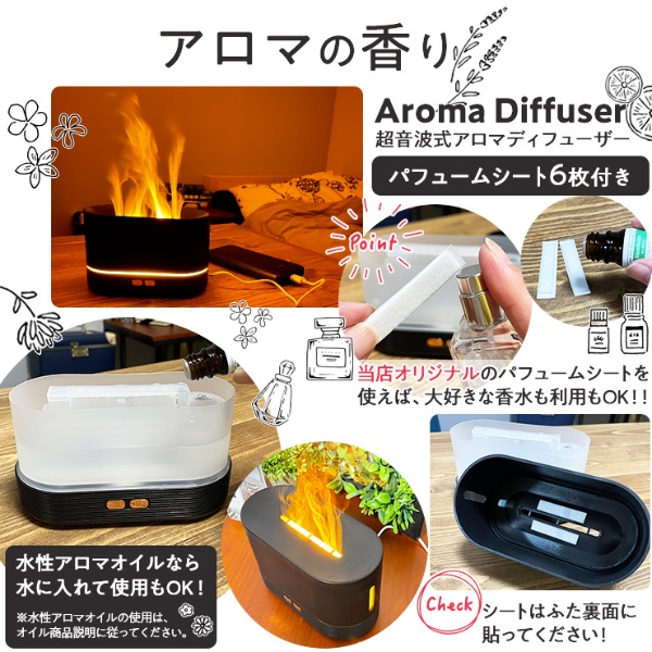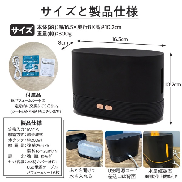 焚き火風アロマディフューザー ● ミストと光で作る「フェイク炎」 安全に「焚き火風」を楽しむ。 お部屋の中でも炎のゆらぎでリラックス。 ● お洒落な間接照明(インテリア照明)に あたたかなオレンジLEDライトが雰囲気たっぷりに部屋を照らしてくれます。 ● アロマディフューザー 水性アロマオイルを水に入れることが出来るディフューザーです。 ● 当店オリジナル!パフュームシート付 好きな香りを使えるように、パフュームシートをつくりました。 いつもの香水の香りや水性以外のアロマオイルもシートに吹きかけて使うことができます。 ※別の香りを使用する時はパフュームシートの交換が必要です。 ● 自動停止機能付き ■サイズ(約):W16.5×D8×H10.2cm ■重量(約):300g ■定格入力:5V/1A ■噴霧方式:超音波式 ■噴霧量:強 約25ml/h、弱 約180〜20ml/h ■調光:強、弱、ゆらぎ ■商品内容: - 本体 - USB電源ケーブル - パフュームシート6枚 - 日本語説明書 ※記載は商品仕様の一部です。仕様説明不足等の理由での返品はできません。特に適合等は必ずご確認ください。