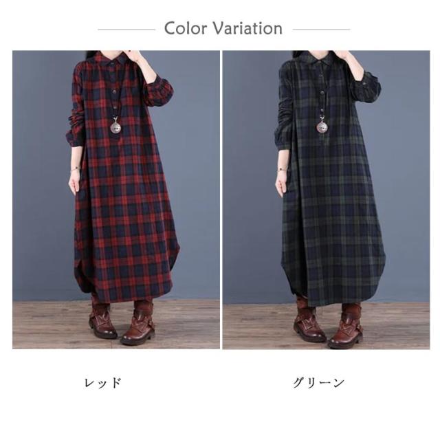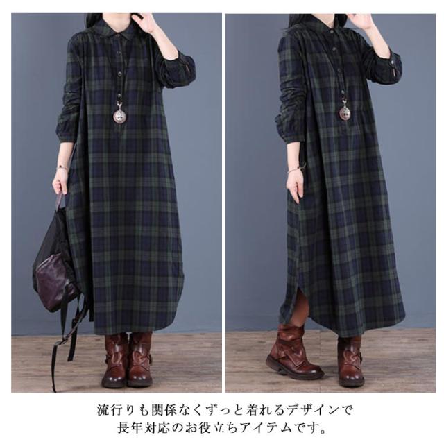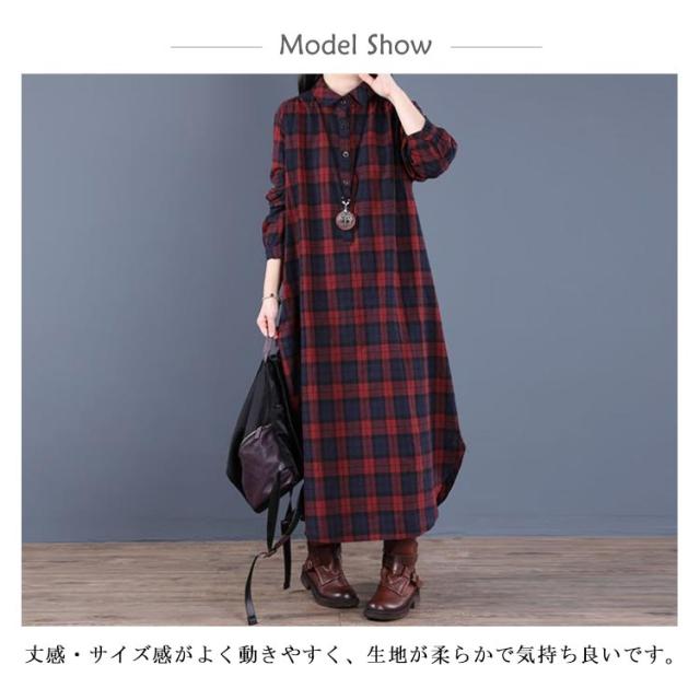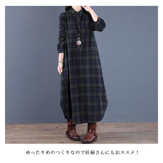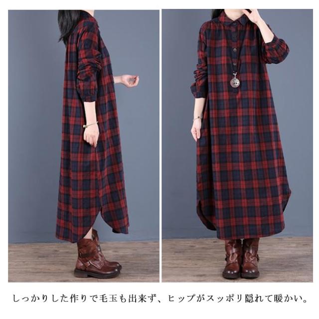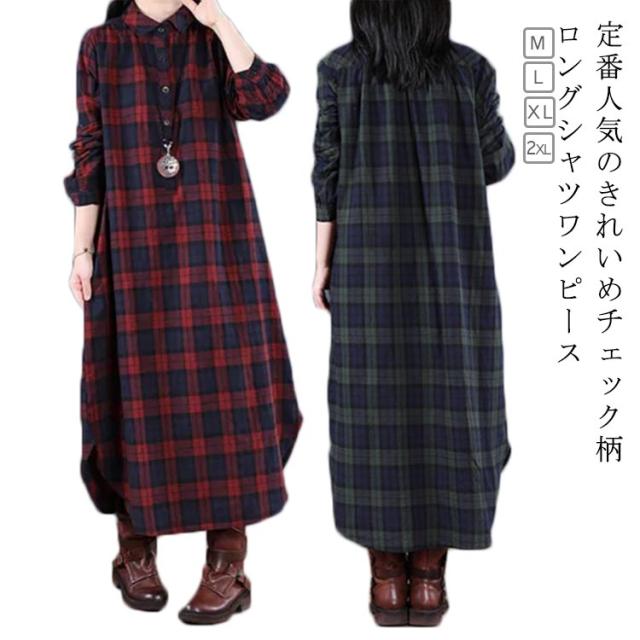 チェック柄 マキシワンピース シャツワンピース ロングワンピース シャツワンピ ガウンシャツ ネルシャツ 長袖 春秋 ワンピ ラウンドテール プルオーバー 大きいサイズ ゆったり 体型カバー 着痩せ 妊婦 産後 シンプル カジュアル エスニック 大きいサイズ ギフト 送料無料