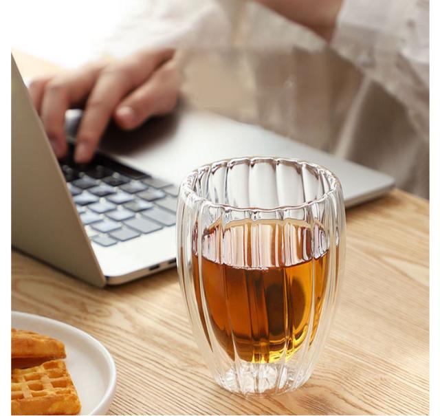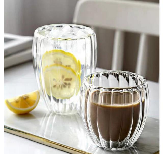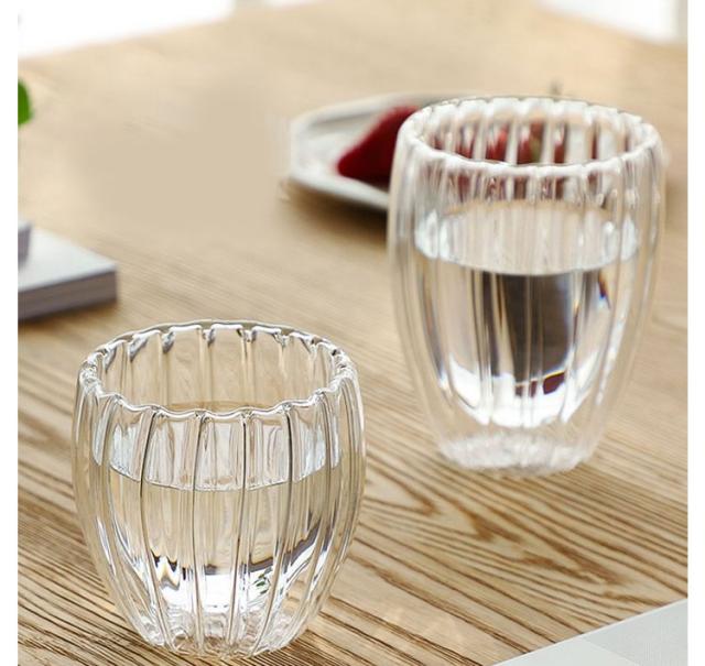 | ストライプに加工されたガラスが目を惹くダブルウォールグラスです。 2個セット 外気の影響を受けにくい保冷性・保温性に優れた二重構造です。冷たい飲みのものを入れても結露しにくいため、テーブルがすぐに濡れてしまうことも少ないです。 ダブルウォールデザインで、ドリンクはまるで宙に浮かんでいるように見え、飲みものの美味しさと同様に美しさも見事に演出してくれます。 シンプルながらも上品で美しい雰囲気が魅力的なグラスです。 | |