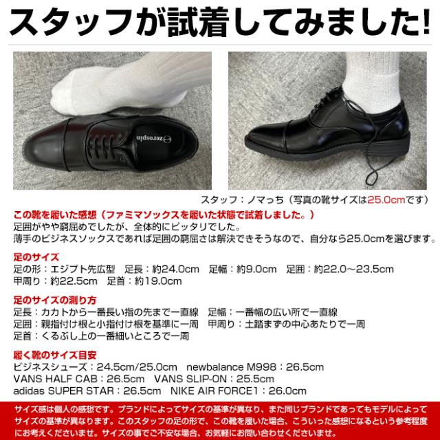 普段履いているビジネスシューズ(26.5cm)と同じ26.5cmを試着したところ、ピッタリでした。