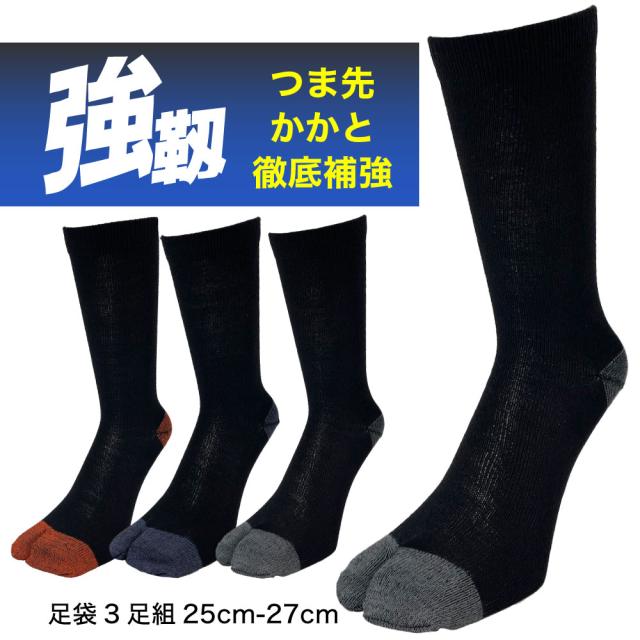 足袋ソックス メンズ 強い 破れにくい 強靭 ワークソックス 3足セット 指付 つま先かかと補強 安全靴 作業用 25-27cm