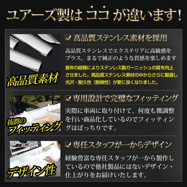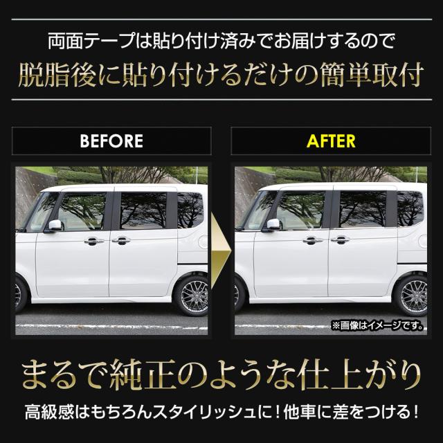 高品質なステンレス素材を使用した、純正のような深い光沢のメッキパーツが登場。 エクステリアに高級感をプラスして、ワンランク上のドレスアップを手に入れられます! 実際に車両に取り付け、何度も微調整を行い商品化しているのでフィッティングはバッチリ。 経験豊富な専任スタッフが一から制作しているので他社製品にはないデザイン・仕上がりをお届けいたします! 届いた時点で強力両面テープがメッキ裏面についておりますので、あとは取り付け箇所をしっかり脱脂して貼り付けるだけでOKです! 必要に応じて付属のマスキングテープや両面テープを使用してください。 |