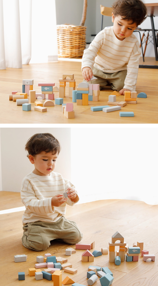| セット内容 | 【60ピース】 円柱×4個、四角柱×7個、立方体×22個、 長方形プレート大×4個、 長方形プレート小×14個、 変形×2個、三角×4個、半円×3個 |