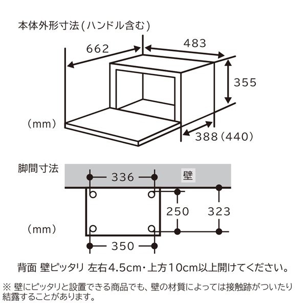 お手入れ簡単、27Lワイド&フラット庫内オーブンレンジ ■庫内容量:27L ■本体サイズ(約):幅48.3×奥行38.8×高さ35.5cm(取っ手含む最大奥行:44.0cm) ■庫内有効サイズ(約):幅37.5×奥行32.3×高さ21.3cm ■重量:約14.5kg ■オートメニューの数:72 ■トースト:○ (手動・裏返し必要) ■付属品:外して丸洗いテーブルプレート1枚(オーブン兼用):38.5×31.1cm レンジ機能 ■消費電力:最高1450W ■出力:1,000W※、600W、500W、200W相当、100W相当 ※(自動:最大3分間)短時間高出力機能です。オート調理の限定したメニューにのみ働きます。 オーブン/グリル機能 ■消費電力:1340W ■出力:1300W ■温度調節範囲:100〜210℃、250℃※、発酵(30・35・40・45℃) ※250℃の運転時間は約5分間です。その後は自動的に210℃に切りかわります。 ■2段調理:× ■設置必要スペース 背面ピタ置き、上面10cm、左右4.5cm以上あけて設置して下さい。 ※記載は商品仕様の一部です。仕様説明不足等の理由での返品はできません。特に適合等は必ずご確認ください。