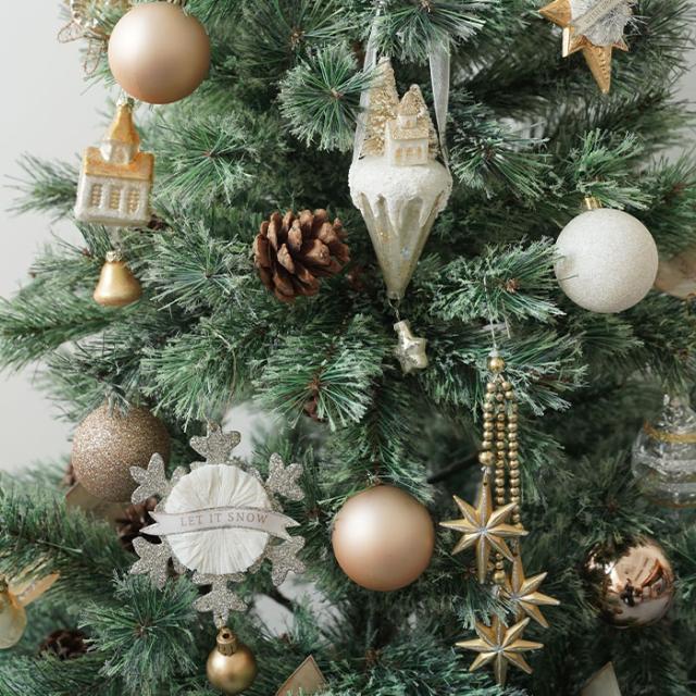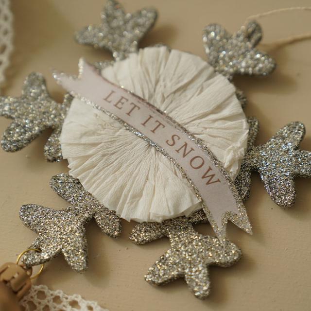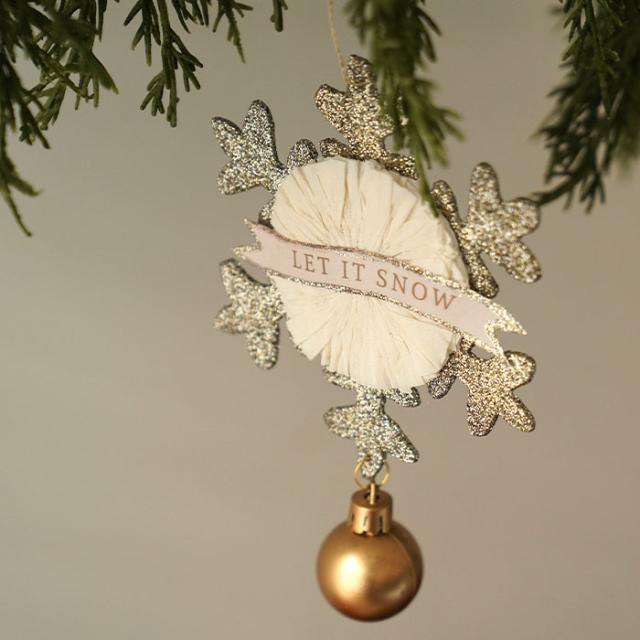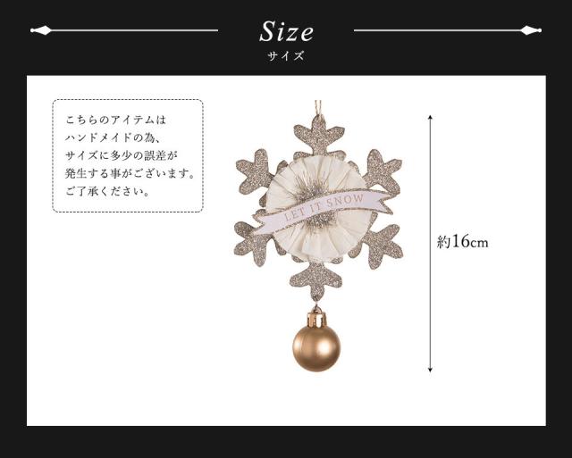 ★おしゃれなスノーフレークのオーナメントです。 キラキラとグリッターが散りばめられた六角形の雪の結晶にゴールドのオーナメントボールがひとつ吊るされています。中央にはペーパークラフトの可愛らしい白い花と「LET IT SNOW(雪を降らせよう)」の文字。 ぱっと目を引く華やかさがありつつもどこかノスタルジックな雰囲気が漂う素敵なデザインに仕上がっています。 クリスマスツリーに飾るのはもちろん、玄関先やリビングなどのインテリアとしてもお使いいただけます。 サイズは高さが約15cmです。 |