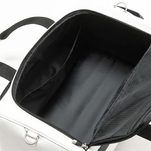 開口部裏側は視認性の良いメッシュ仕立てのファスナーポケットで、本体内部には、ファスナーポケット、二つの仕切りポケット付き。