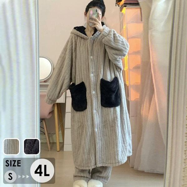 熊耳 ルームウェア もこもこ パジャマ 冬 長袖 ナイトガウン クマ 大きいサイズ 着る毛布 前開き フード付き 寝巻き 部屋着 暖かい あったか 着ぐるみ モコモコ 大人用 ふわふわ 動物 レディース 女性用 ガウン かわいい 可愛い ギフト プレゼント