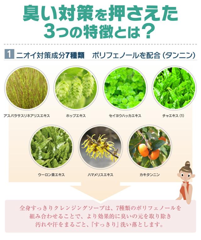 1. ニオイ対策成分下記7種類のポリフェノール配合し、不快なニオイの元をスッキリ洗い流す。