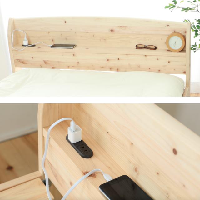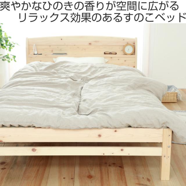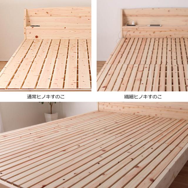 繊細すのこベッド ダブル 国産ひのき 宮棚 2口コンセント付 6本脚 日本製 ( ひのき ヒノキ すのこ ベッド ベッドフレーム ベット 天然木 木製 棚 高さ調節 島根県産 高知四万十産 ナチュラル 北欧風 シンプル )