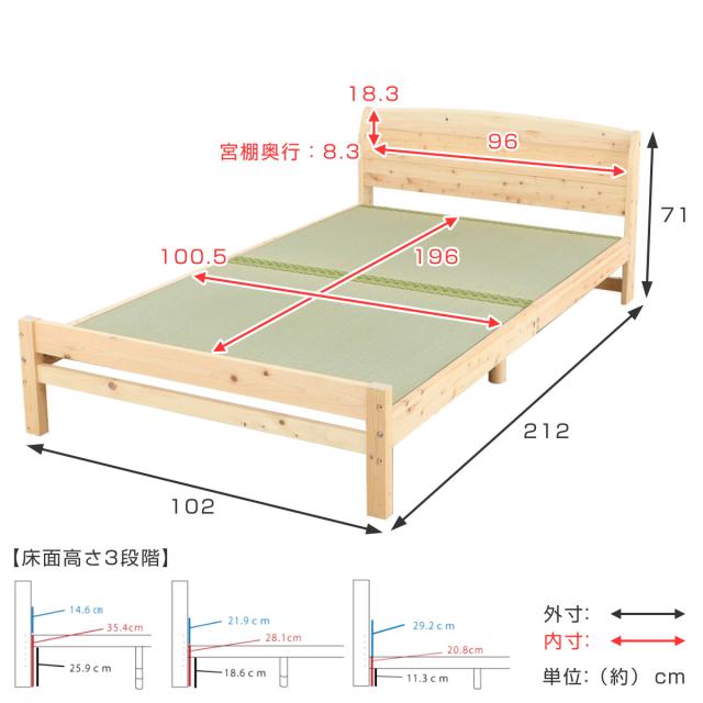 い草ベッド シングル い草床板 国産ひのき 宮棚 2口コンセント付 6本脚 日本製 ( 畳 畳ベッド ひのき ヒノキ ベッド ベッドフレーム ベット 天然木 木製 棚 高さ調節 島根県産 高知四万十産 ナチュラル 和 モダン シンプル )