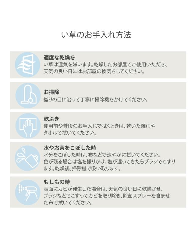 品質:表地=い草100%、裏地=ポリエステル100%(裏貼りありのみ:滑りにくい加工付)※天然素材の特性上、色合い・サイズ等、若干異なる事があります。※ご使用になられる前に、乾いた布で表面を軽く拭いてください。強く拭いたり、濡れた布で拭くと変色する恐れがありますのでご注意ください。※い草は素材の特性上、ささくれが発生する場合があります。その場合は無理に引き抜かず根元からハサミで切り取ってください。 原産国:中国製
