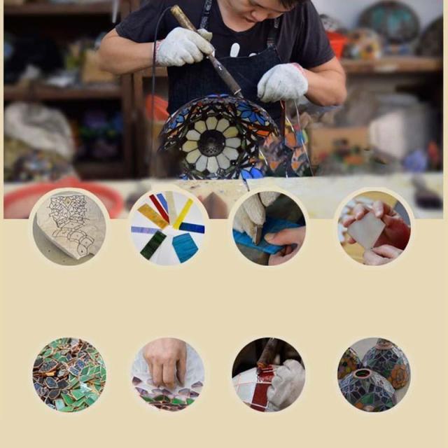 ※従来の伝統の技法と同じく、デザイン、型紙を起こした後にガラスをカット。カットされたガラスは研磨機にかけられた後、コッパーフォイルという銅箔のテープがガラス側面を一周するように巻かれます。そのコッパーフォイルの部分を半田で溶接しガラスピース同士が一体化します。