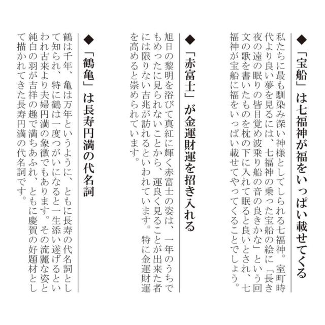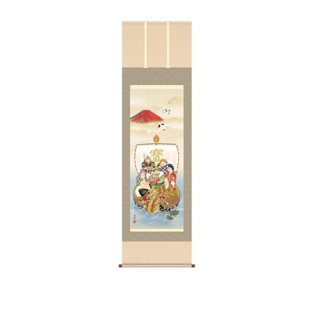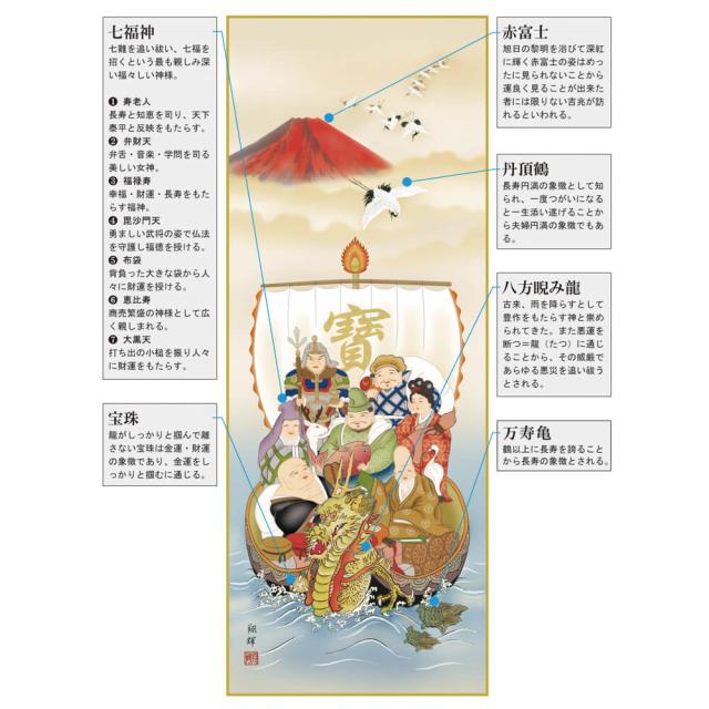 赤富士を背に純白の丹頂鶴が飛翔し、龍神の船首を持つ宝船には七人の福徳の神様「七福神」が集います。