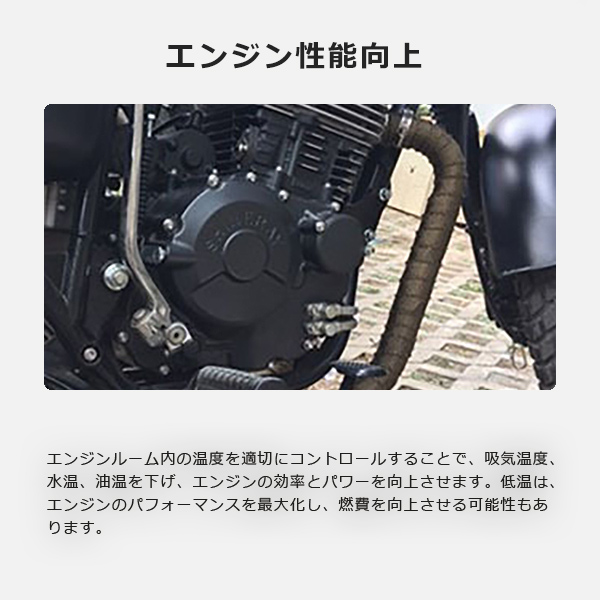 高熱対策とエンジン性能向上の効果により、エンジンルーム内の温度をコントロールし、吸気温度、水温、油温を下げます。