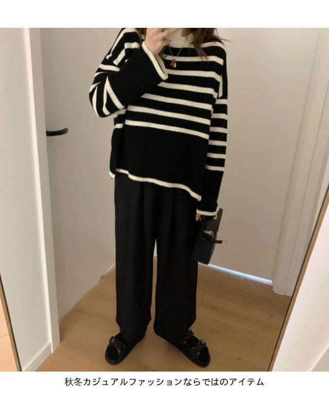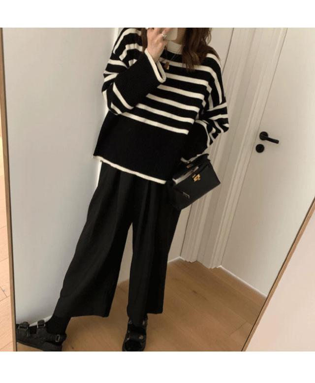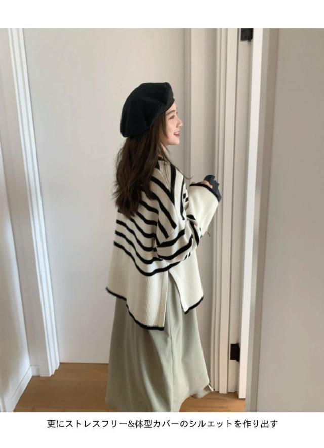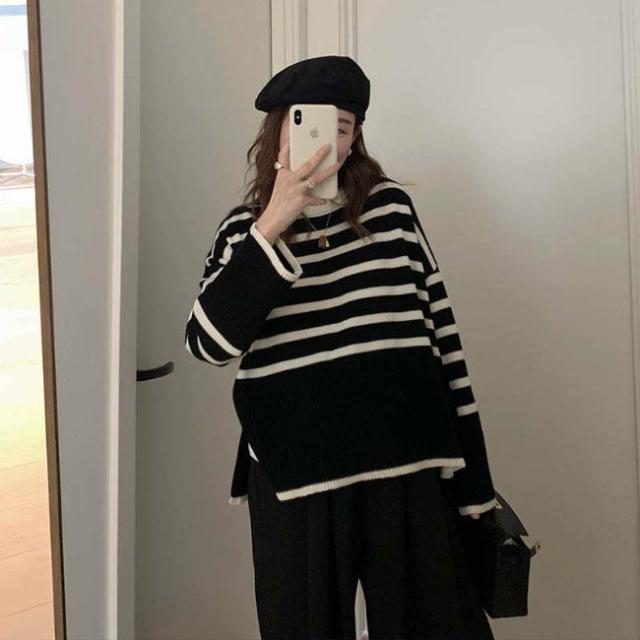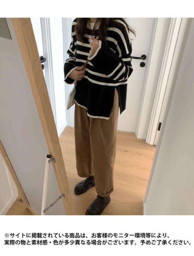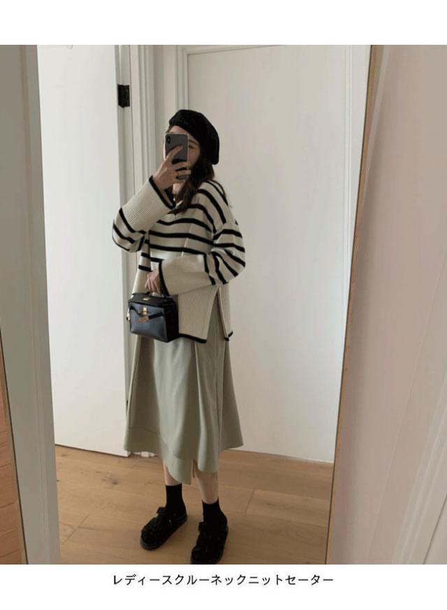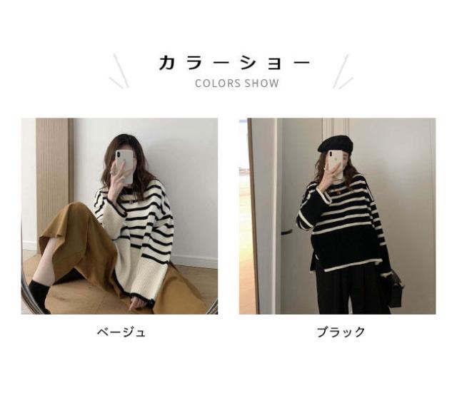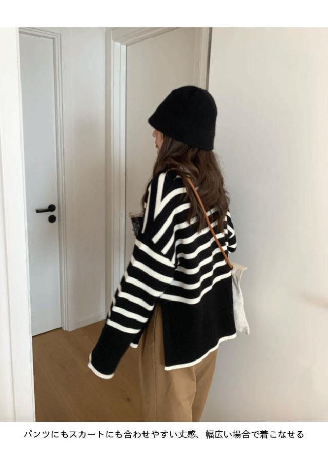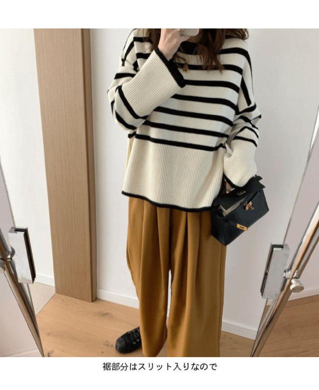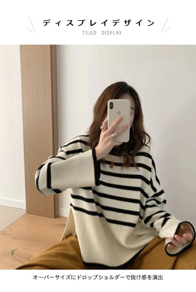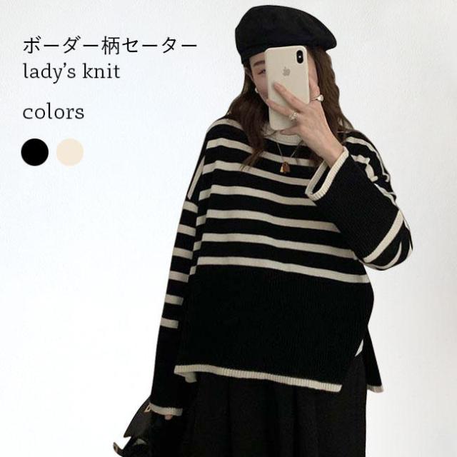 ニット セーター 長袖 ボーダー柄 ニット レディース ニットセーター オーバーサイズ 縞柄 セーター クルーネック 体型カバー スリット入り トップス ニット ド