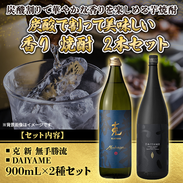 商品名 克・DAIYAME 炭酸で割って美味しい 香り焼酎2本セット 容量 900mL×2種セット 原材料名 さつまいも(鹿児島県産)、米麹(国産米) アレルギー特定原材料 ー 保存方法 常温 アルコール度数 25度