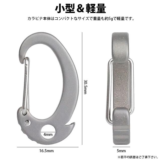 カラビナ本体はコンパクトなサイズで重量も約5gで軽量です。