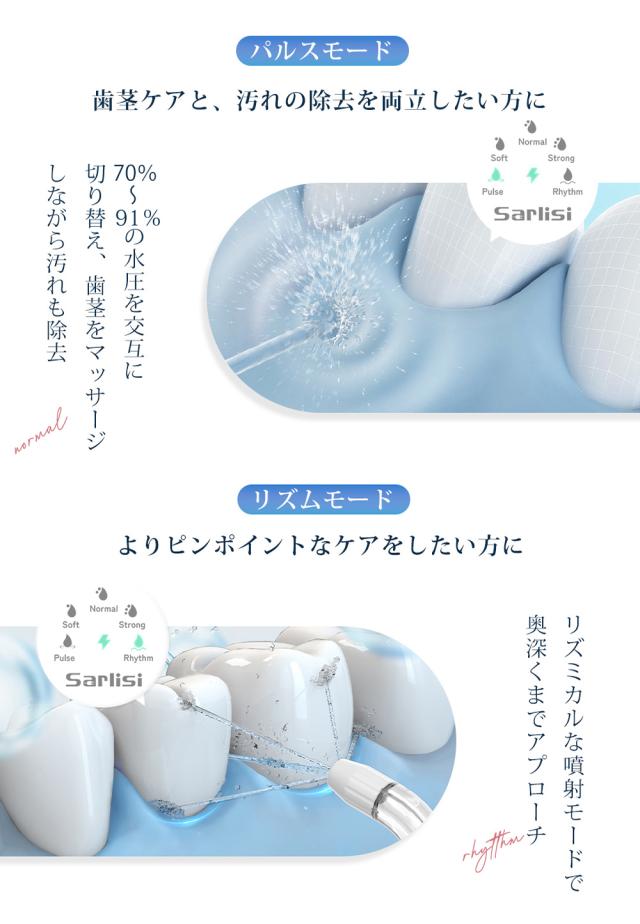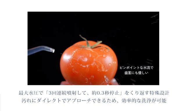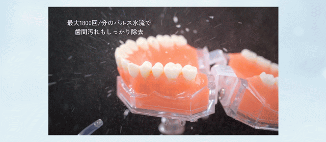 また、一定の間隔で少しずつ水が噴射されるパルスモードも搭載して、断続的なパルスジェット水流が歯垢や汚れを浮かして剥がし落とします。