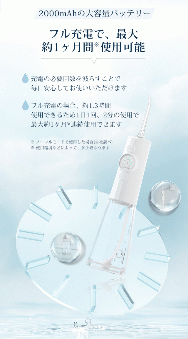 2,000mAhのリチウムイオンバッテリーを搭載しており、1度の充電で【最大約45日間】使用可能です。(※1日3分ご使用の場合)
