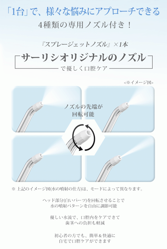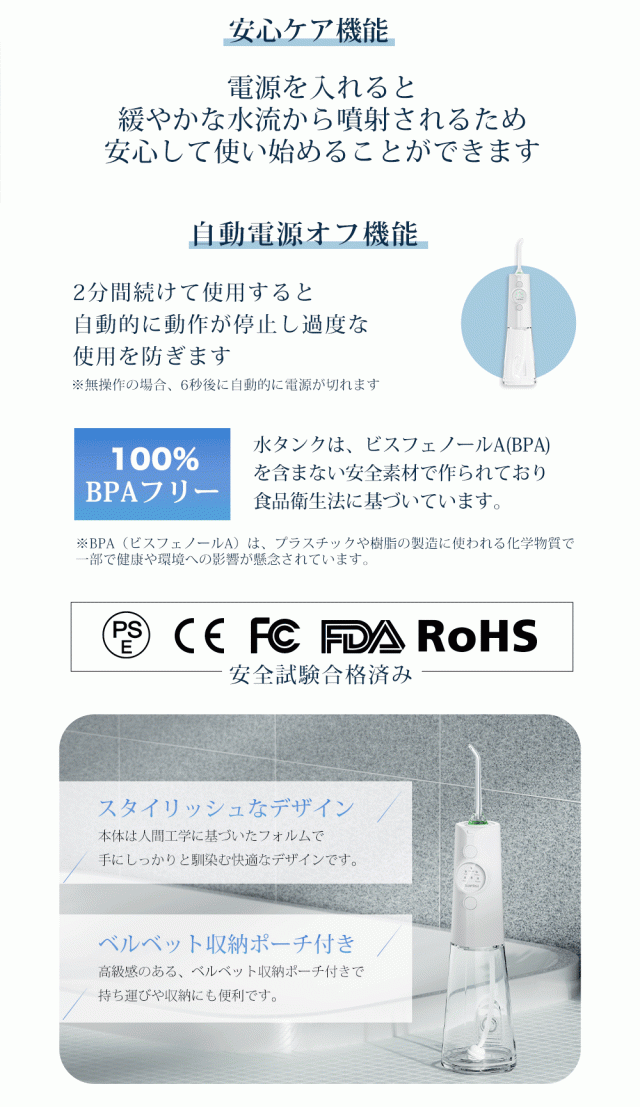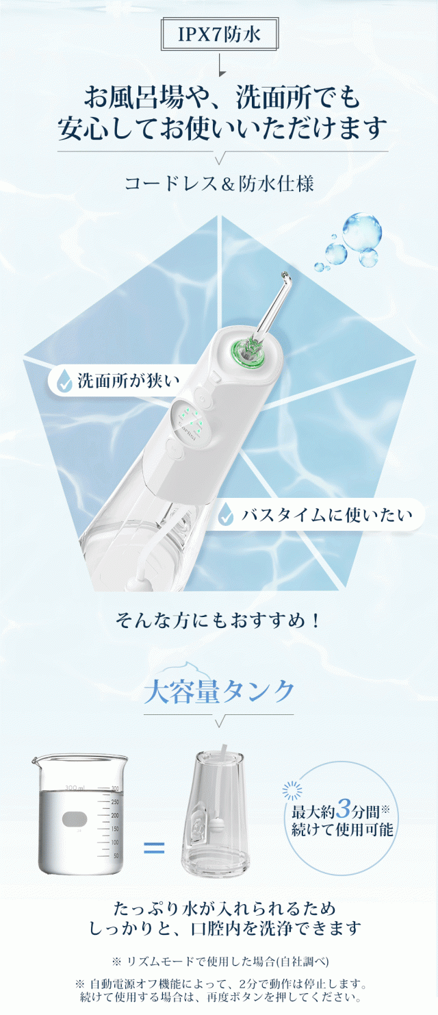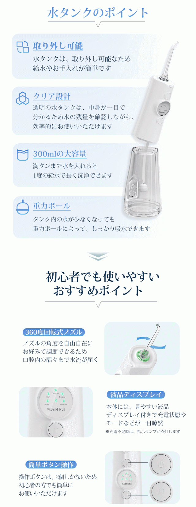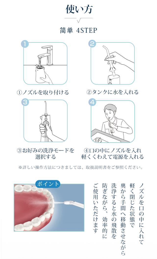 本製品は、300mlの大容量タンクを備え、持ちやすいハンディタイプで、1回の給水ですべての歯間に行き渡る。