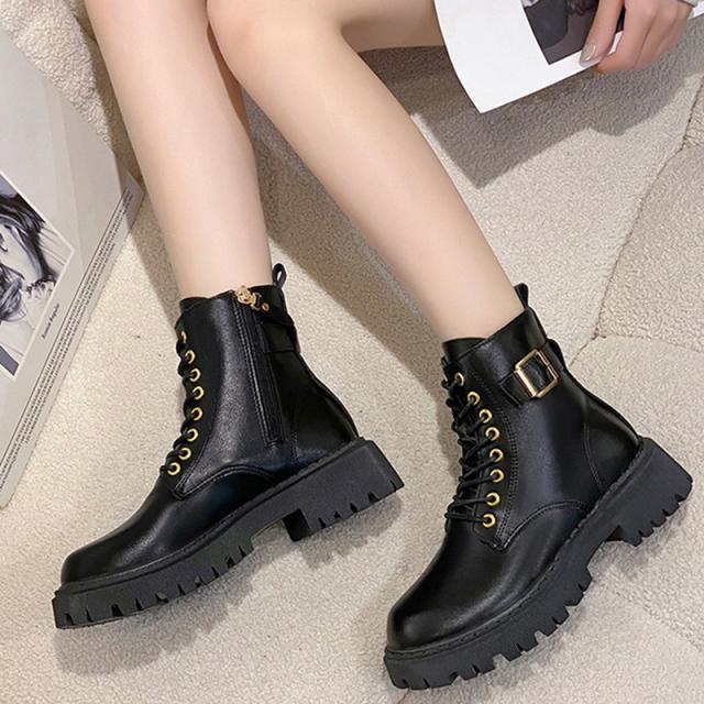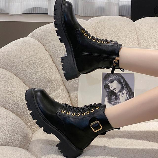 ブーツ レディース ショート 厚底 4.5cmヒール 黒 レースアップ サイドジップ PUレザー おしゃれ 着脱簡単 シンプル コ