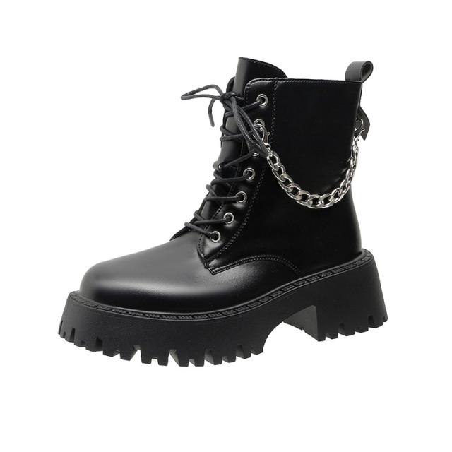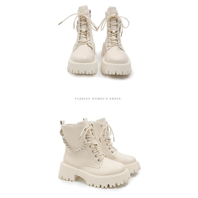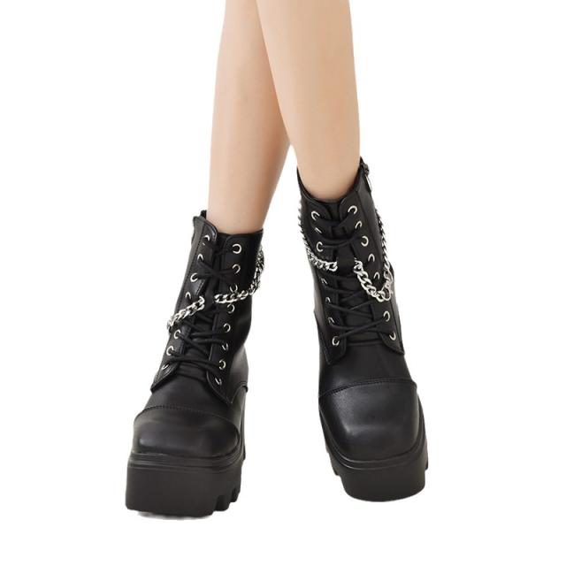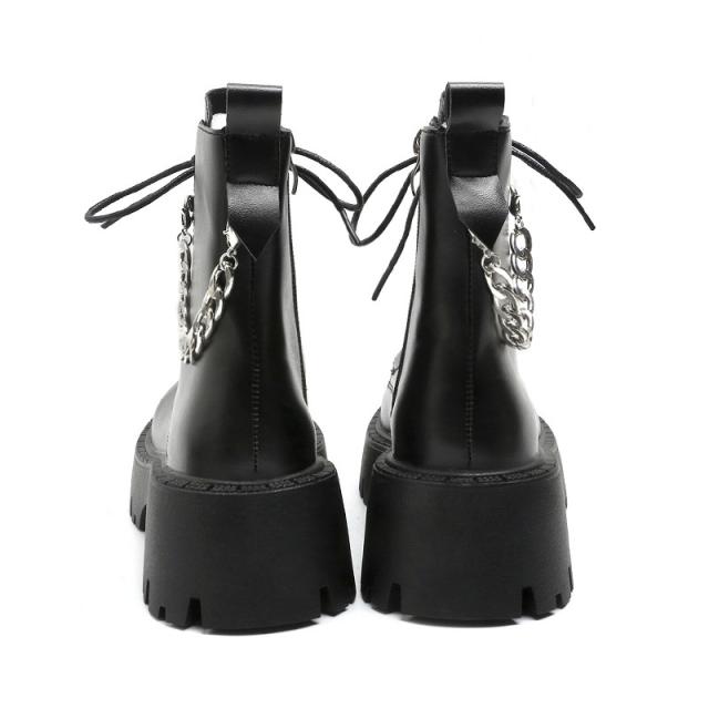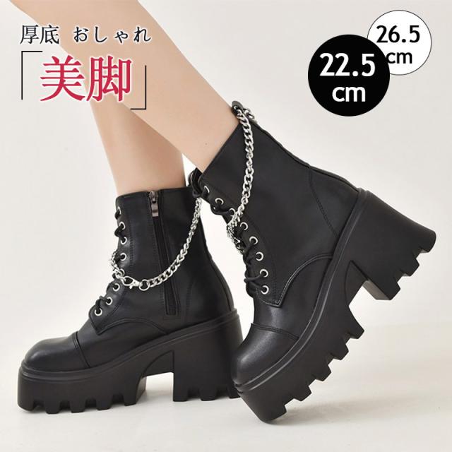 ブーツ レディース ショート 厚底 5cmヒール 黒 白 レースアップ サイドジップ PUレザー おしゃれ 着脱簡単 シンプル コ