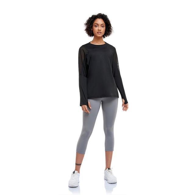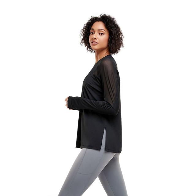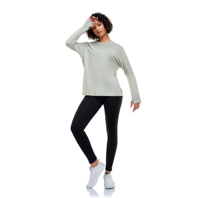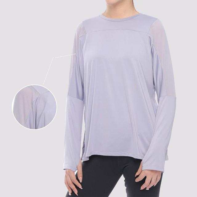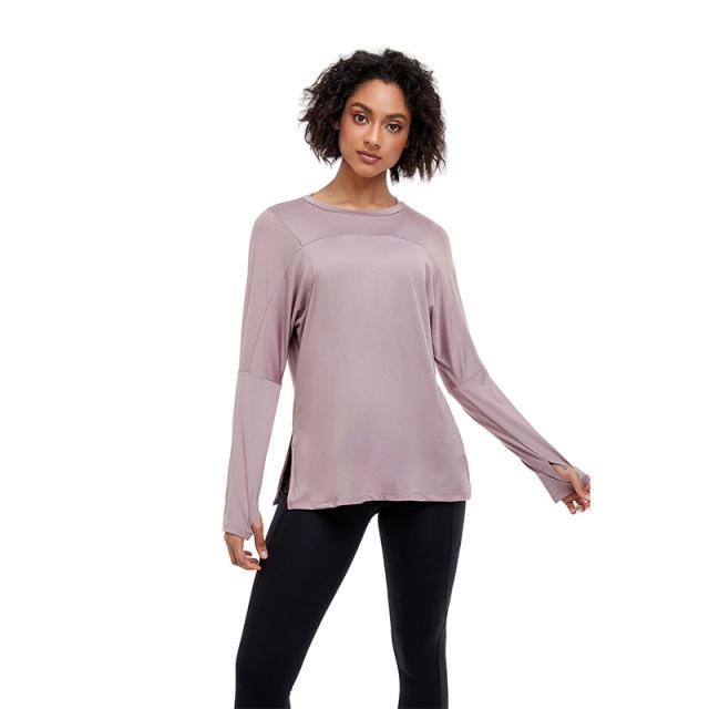 - ヨガ用に購入、サラッとした生地で動きやすそうです。袖口に指を通す部分があり、腕を上げても袖が下がらず使えます。