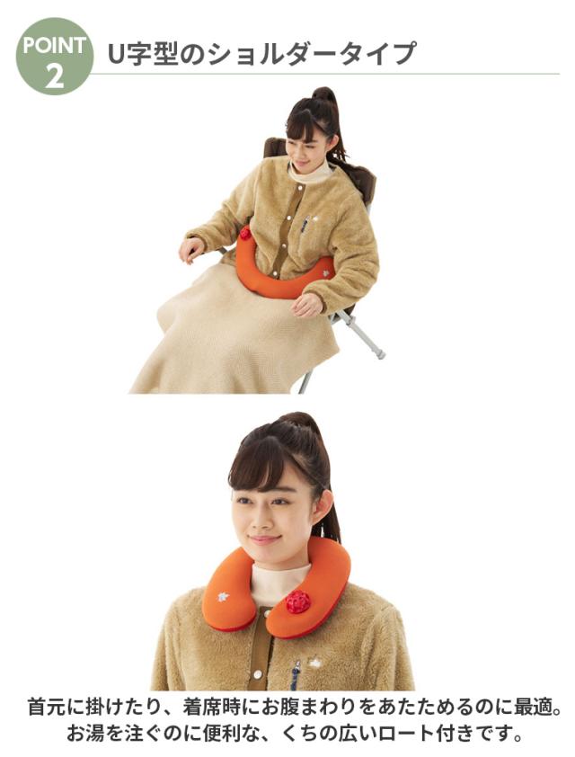 U字型のショルダータイプで、首元に掛けたり、着席時にお腹まわりをあたためるのに最適。