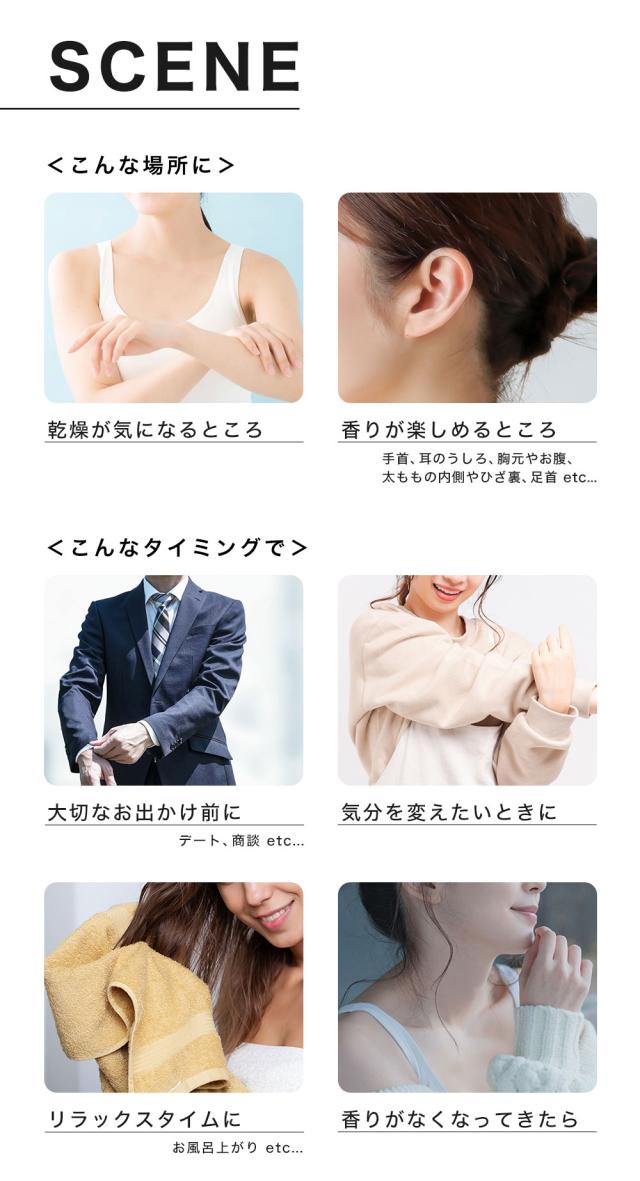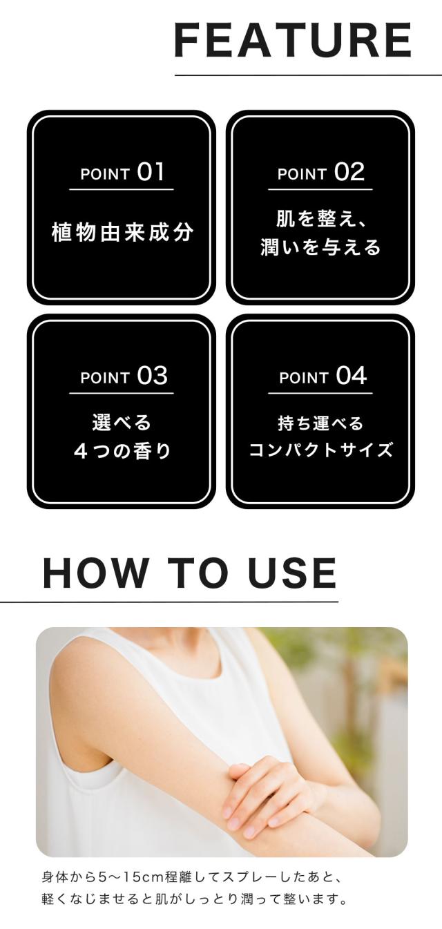 | 使用方法 | 身体から5〜15cm程離してスプレーしたあと、軽くなじませます。 |