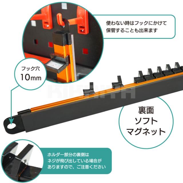 ●レンチを最大15個収納できるマグネット付ホルダーです レンチ以外にもさまざまな工具を収納できます ●ホルダー部分は自由にスライド出来て、取り外しも可能 ●裏面ゴム製ソフトマグネット付きなので、キャビネットや工具箱などのスチール面に 取付け出来る ●強力なネオジウム磁石が縦向きでも横向きでもしっかり保持します ※縦向きで使用する際はあまり重いものは載せないでください 工具の重みでホルダー部分が下がってきてしまう事があります ●使わない時はフックに引掛けて保管することもできます 品番:MH-26 |