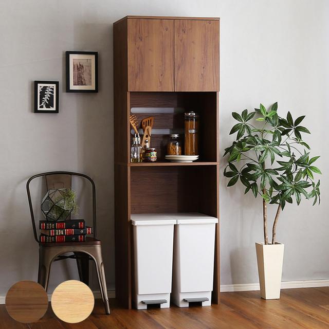 ごみ箱の上はデッドスペースになりがち。「扉収納」「オープン収納」「ごみ箱収納」3つの収納で毎日の生活を快適な空間にしてくれる、キッチンラックです。本体は天然木のような木目が表現されており、どんなテイストのお部屋にも合わせやすいです。