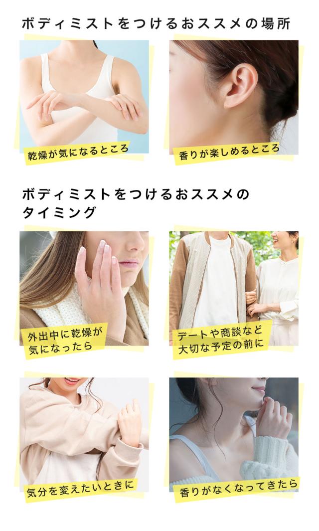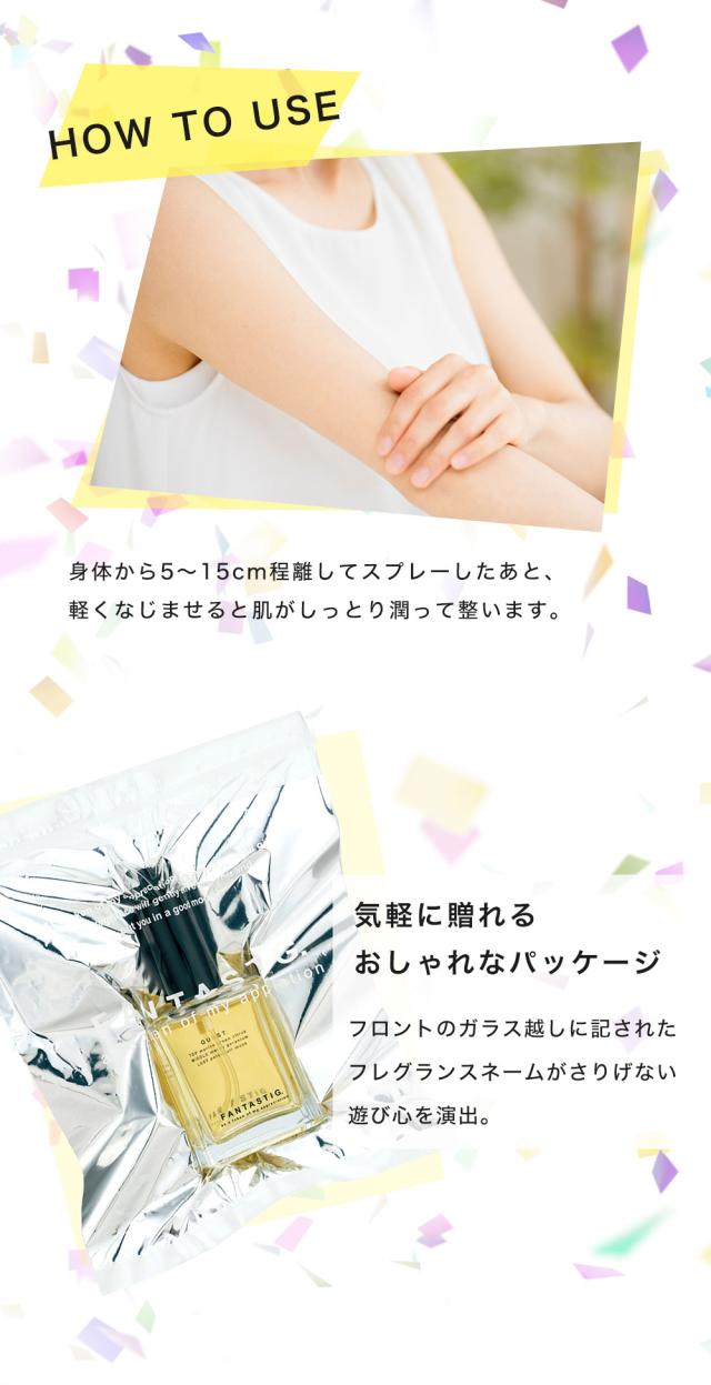 | 使用方法 | 身体から5〜15cm程離してスプレーしたあと、軽くなじませます。 |