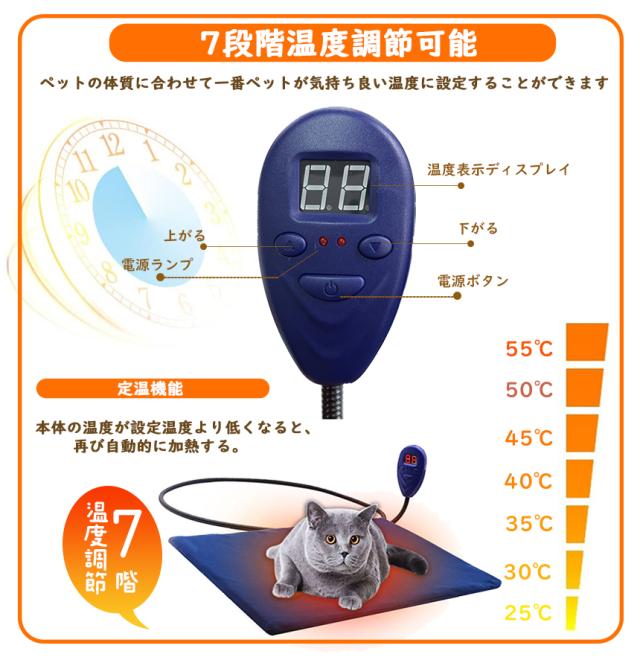 ヒーターの温度を調節するサーモスタットは、カーペットを適切な温度に保ち、無駄な電力を節約し、昼寝や夜間でも自由に調節できます。25~55℃、7段階の温度調節が可能です。(40度オススメ)季節によって温度を使い分けられるのも便利です。温度の上がりが緩めて、一度設定した温度になるまでに数分ほどかかりますので、予めご了承ください。(40度オススメ) ・低温の状態だと加熱スピードは遅くなります。そのため、ホットカーペットをご利用になる際に、ペットを商品の上に乗せてください。そのまま10分間経過すると、ホットカーペットはだんだん暖かくなり、商品の機能を発揮します。