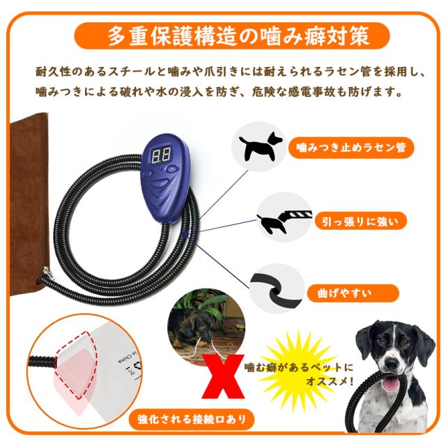 ペット用ホットマットは温度センサーを内蔵しており、万が一、過熱や漏電などの異常が発生した場合は、自動的に電源が切れます。そして、噛みつき防止ラセン管も安全設計のひとつ、ペットが噛んでも漏電の危険はありません。