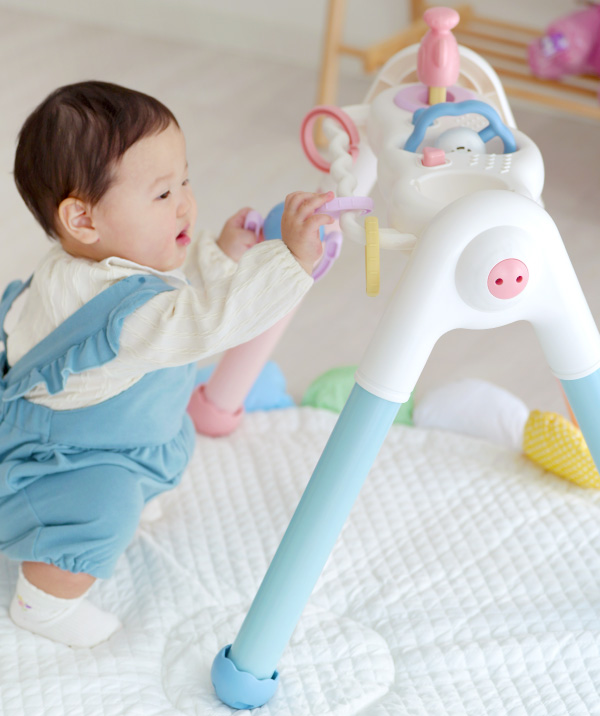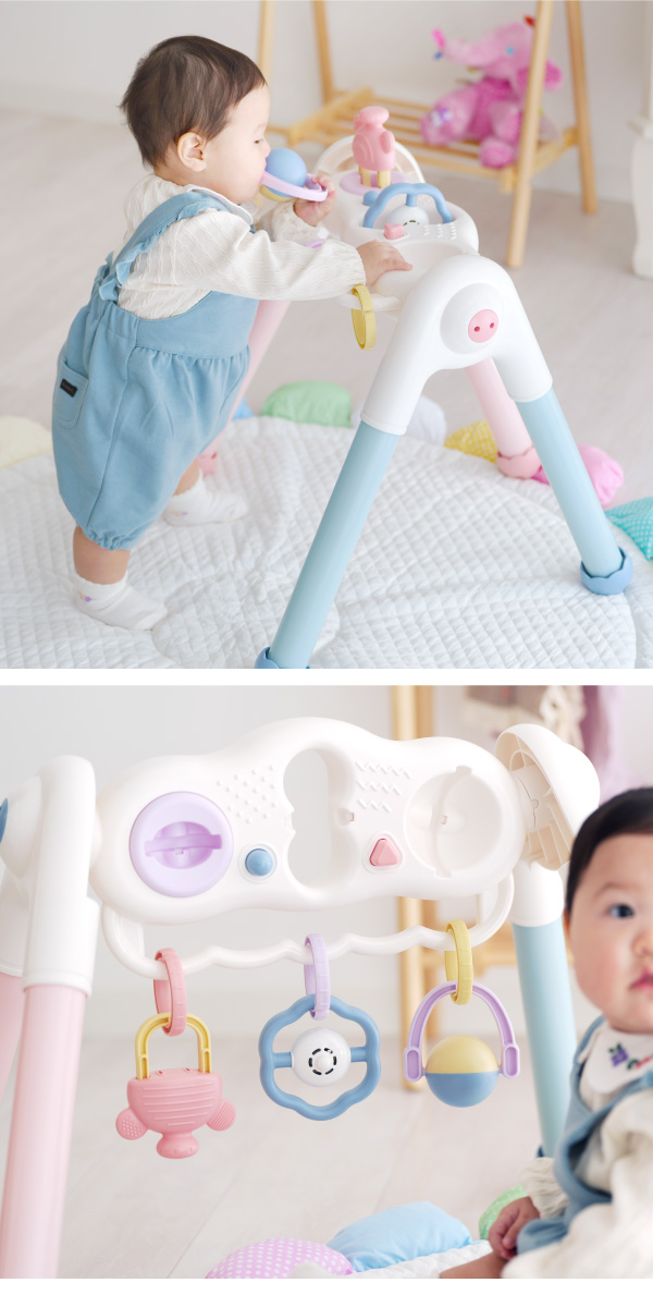赤ちゃんの脳を刺激し、お子さまの発育に重要な、指先遊び・手遊びが自然に楽しくできる工夫がいっぱいのベビージムです。