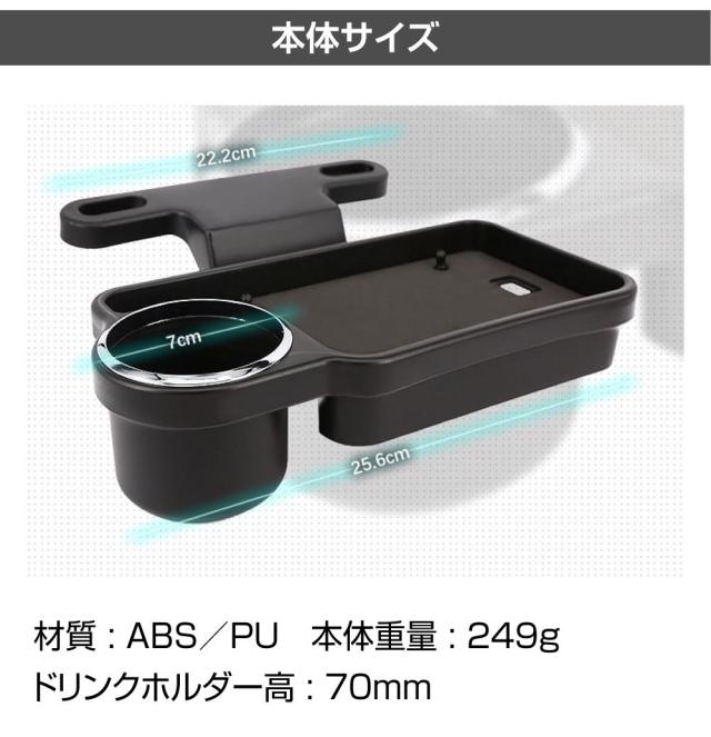 テーブル幅:25.6cm ドリンクホルダー幅:70mm ※直径70mm以上のペットボトルは入りません。 素材:ABS / PU 重量:249g |