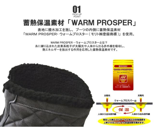 表地に撥水加工を施し、ブーツの内側に蓄熱保温素材「WARM PROSPER・ウォームプロスター(モリト?登録商標)」を使用した、暖かいブーツ。