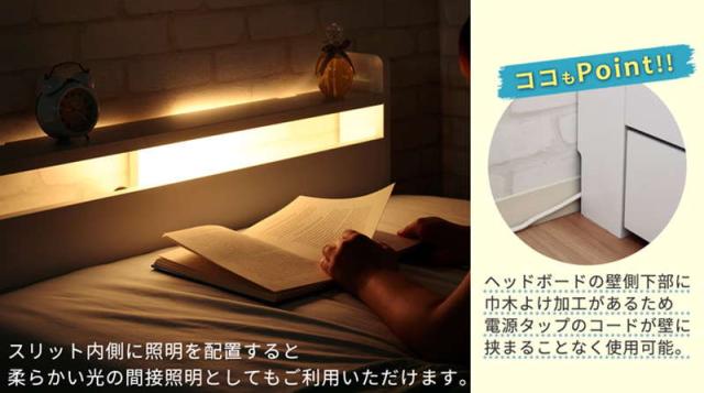 ●ヘッドボードは隠せる収納棚付きタイプで、電源タップなどをヘッドボード裏に隠して収納することができます。