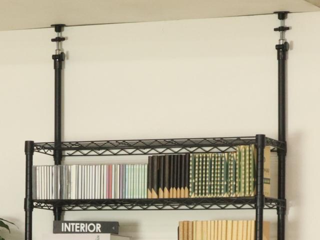 棚の上部に突っ張り支柱を取り付けることで、しっかりと固定することができます。ラック本体を天井と床で支えるので、万が一の時の転倒防止対策にもなります。