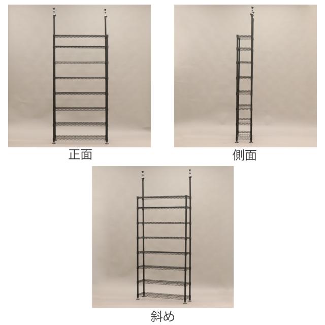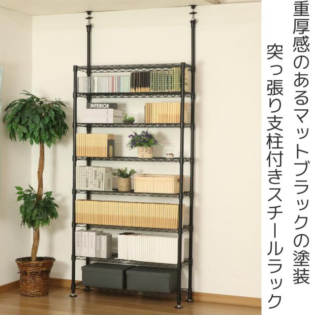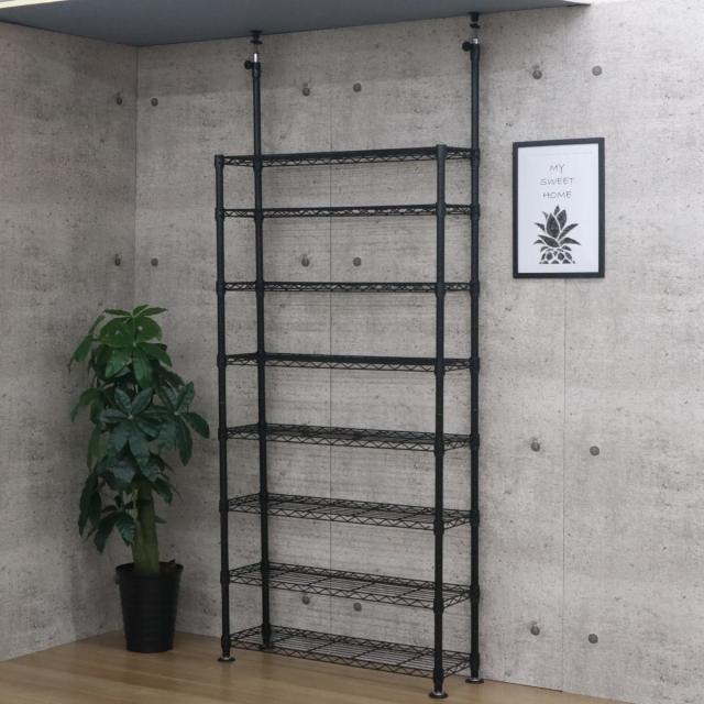 突っ張り スチールラック 幅93cm 8段 高耐荷重 簡単組立 ( つっぱり棚 ラック スリム 棚 メタル 収納棚 壁面収納 黒 収納ラック スリムラック キッチンラック ランドリーラック 本棚 省スペース 転倒防止 地震対策 )