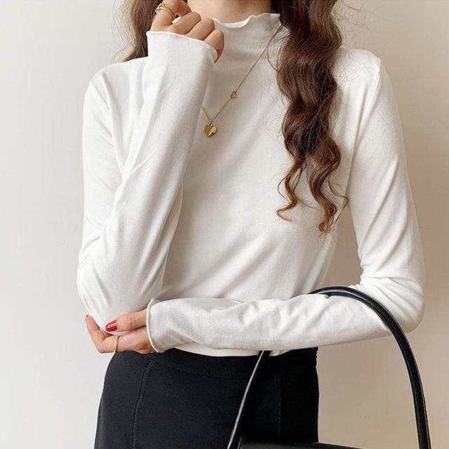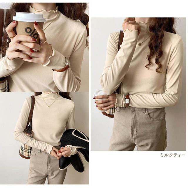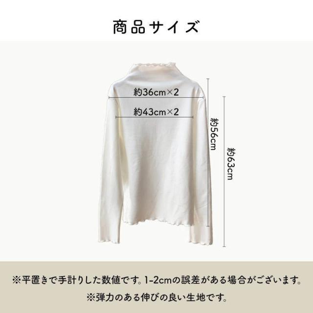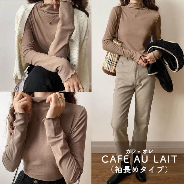 重ね着にもオススメ メロウ プチハイネック カットソー ハイネックT レイヤード 長袖Tシャツ 大人 柔らかい 伸縮性 ストレッチ メローフリル ブラウン 黒 白 手の甲まである