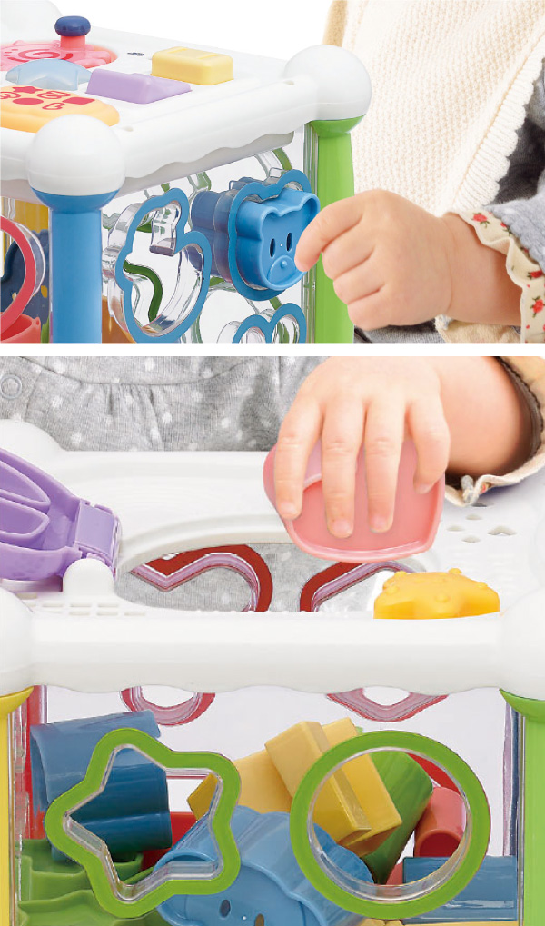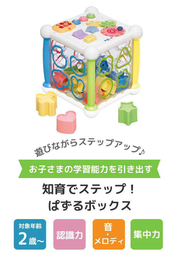 お子さまが識別しやすいよう「形と色を考えた16コのブロック」、「認識・想像を促す透明のボックス」、「脳を刺激するボード遊び」の3つの知育ポイントをおさえた、お子さまの学習能力を引き出すぱずるボックスです。