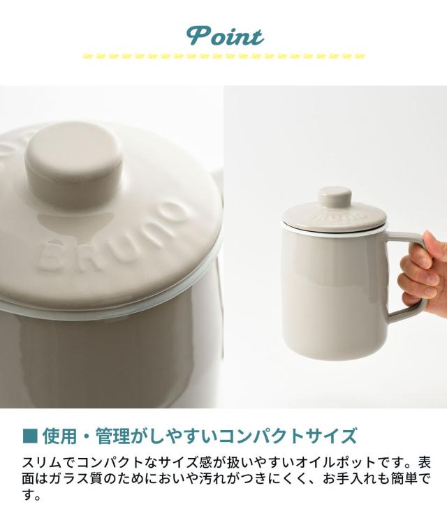 BRUNO/ブルーノ/ホーローオイルポット/オイルポット/富士ホーロー/FUJIHORO/ホーロー/ほうろう/琺瑯/油ポット/油こし器/油こし/油入れ/天ぷら/揚げ物/油/再利用/保存/エコ/スリム/コンパクト/1.0L/1L/油入れ/こし網/ステンレスフィルター/フィルター付き/ふた付き/取っ手/オシャレ/おしゃれ/シンプル/キッチン/ギフト/プレゼント
