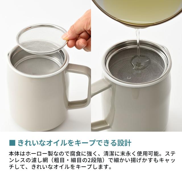 富士ホーローとコラボした、スリムでコンパクトなオイルポット。場所を取らず、取り回しが簡単に行えるのが特徴です。ステンレスの濾し網(粗目・細目の2段階)で細かい揚げかすもキャッチして、きれいなオイルをキープします。