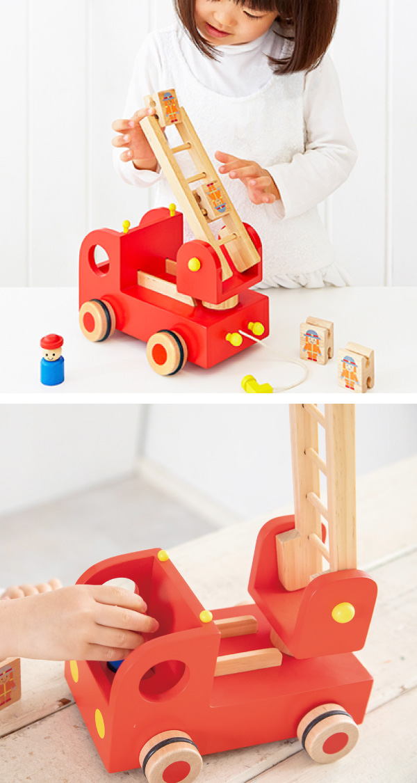 はしごの角度を調整したり、360度回転させたり、運転手を取りはずしたり、ホースを伸ばしたりすることがで き、ごっこあそびの幅を広げます。