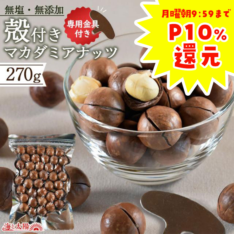 【P10%還元】開けたての香ばしさ!<殻付きマカダミアナッツ270g+割り金具付> ロースト 無塩 無添加 からつき 贅沢 おやつ おつまみ 家飲み 製菓材料 送料無料 メール便 チャック袋 海と太陽 クーポン消化 ポイント消化 殻割り 母の日