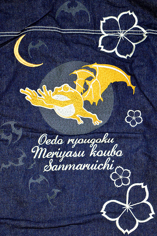 背中には蝙蝠と蛙を組み合わせた、その名もバットフロッグを刺繍しました。